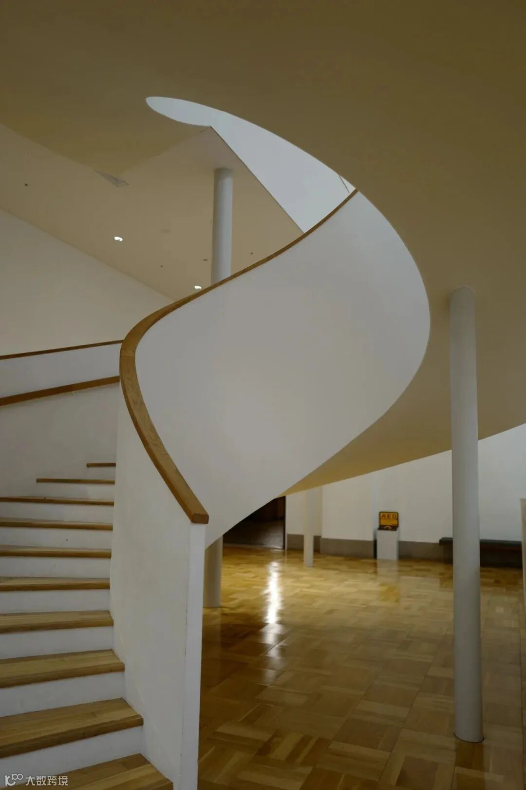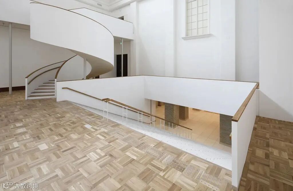 主馆中央厅是纯白色辅以木色装饰的极简风格,旋转楼梯和大部分的留白构成了美术馆的现代感。