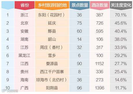 近日,国家旅游局对外公布了拟认定“中国优秀国际乡村旅游目的地”名单(以下简称“名单”),黑龙江雪乡、江西婺源、广西阳朔等10个目的地入选。据某旅行网的大数据平台显示,名单公布后,浙江花园村、北京延庆、安徽黔县等地,关注度出现大幅上涨,最大涨幅达到70.1%。