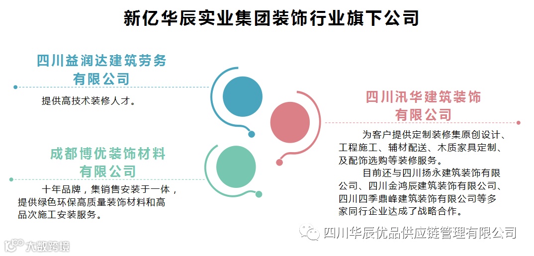 新亿华辰(成都)实业集团有限公司旗下有四川汛华建筑装饰有限公司、四川益润达建筑劳务有限公司、成都博优装饰材料有限公司,组建了装饰装修专业团队为各类企业提供定制装修服务。