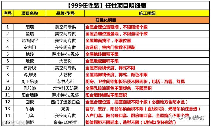 整合了“999”任性装套餐,协议中做到了15项不限装。让大家就不需再担心被装修公司忽悠,增加后期增项的花销