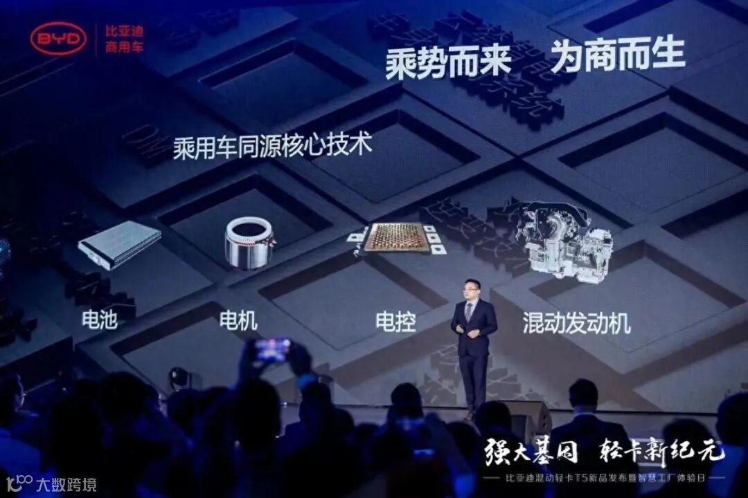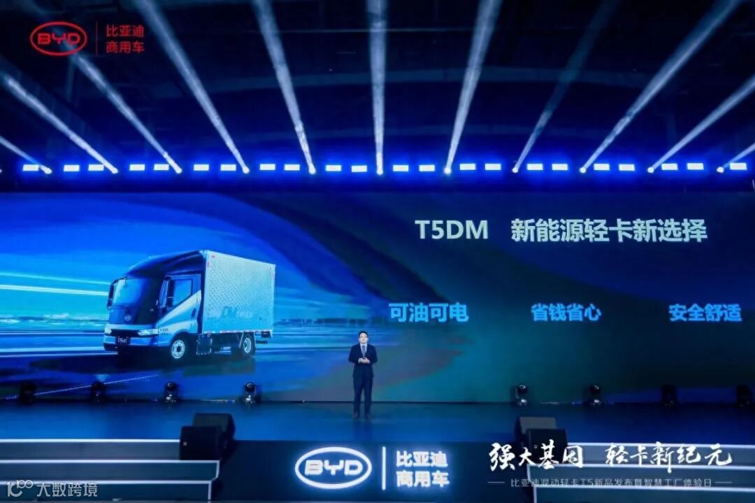 趁势而上。10 月 18 日,比亚迪商用车发布旗下全新混动轻卡T5。比亚迪研究院院长彭旺将其优势言简意赅的概括为:可油可电、高经济性、高安全性的新能源双模混动轻卡 T5DM。这也是比亚迪商用车基于专属的混动技术平台所打造的首款车型。