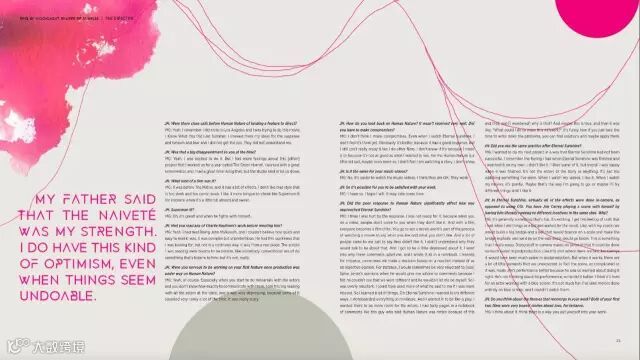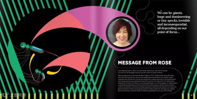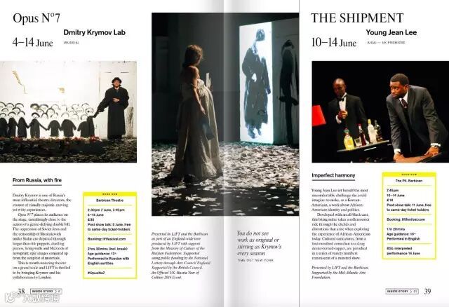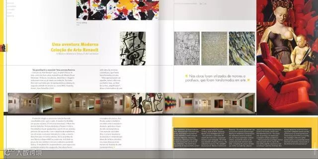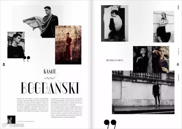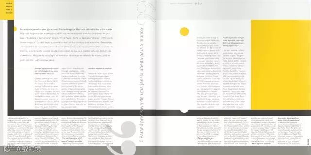 在这本杂志中线又作为装饰性背景出现,增强画面层级。多加一句:黄+黑的色彩搭配几乎是不会出错的搭配方式,应用行业范围通常是以艺术、影视、娱乐、杂志等非商业产业,如果你要排一本企业相关画册。。还是算了吧。
