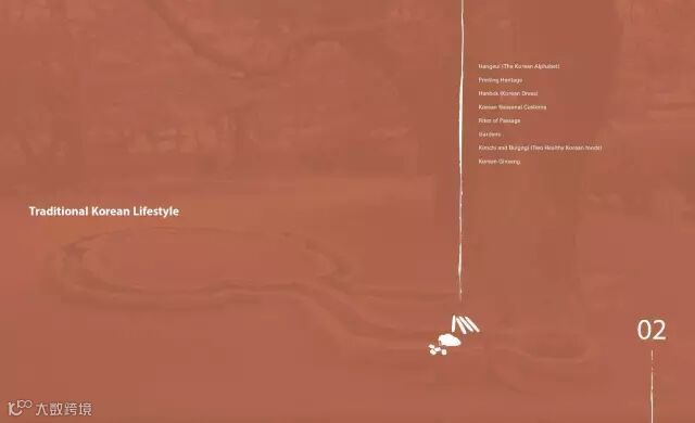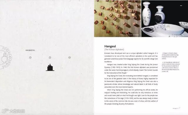 这本韩国文化指南的整体风格偏向大气、干净,点在其中以传统元素的小图标形式出现,对提升画面灵活性及增加视觉层次做出了不可磨灭的贡献,可以试着盖住这几个小图标,恐怕整体气质就要大大降低了。