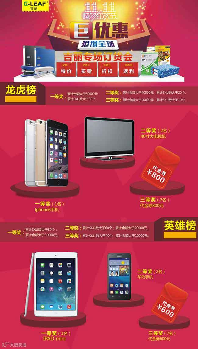 导读:吉丽专场订货会!吉丽文具特惠低价!还有返利,送iphone6,送大电视,送IPAD mini 奖品多多!