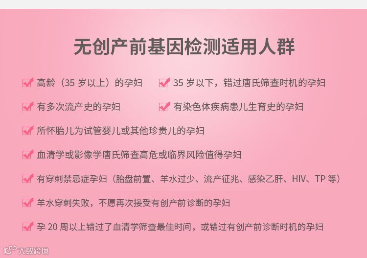 无创产前基因检测(Noninvasive Prenatal Test,NIPT),是对母体外周血中游离的胎儿DNA进行新一代高通量测序,并将测序数据比对到人类相应的染色体参照序列上,结合特定的遗传学信息分析方法,评估胎儿患遗传疾病的风险率,目前评估的疾病种类主要包括染色体非整倍体疾病及单基因遗传病。