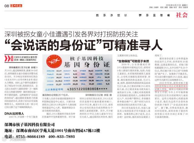 只需取被检者的口腔粘膜细胞,取样安全方便,通过对被检者的DNA进行STR多态性检测,将基因信息、监护人信息及儿童个人信息记录到基因身份证上,制作一个专属个人的基因身份证,有助于被解救儿童的认亲;第三代身份证增加基因身份证;被拐儿童上户口可自动识别,为日后寻找失踪儿童与公安局数据库进行信息比对提供依据。