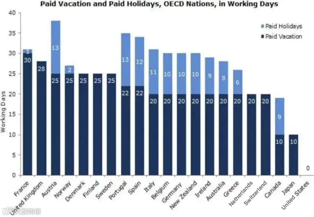 《今日美国》一份报道显示,在全球带薪假期最多的八个国家中,前七位都是欧洲国家。其中奥地利与葡萄牙以年均35天的带薪假期位居榜首;德国与西班牙以一天之差紧随其后;法国,比利时和意大利三国则位居榜单的后三名,年均带薪假日30天,取决于各国劳动法与企业规定的不同,欧洲人一般都有25-40天的年假可以自由支配。
