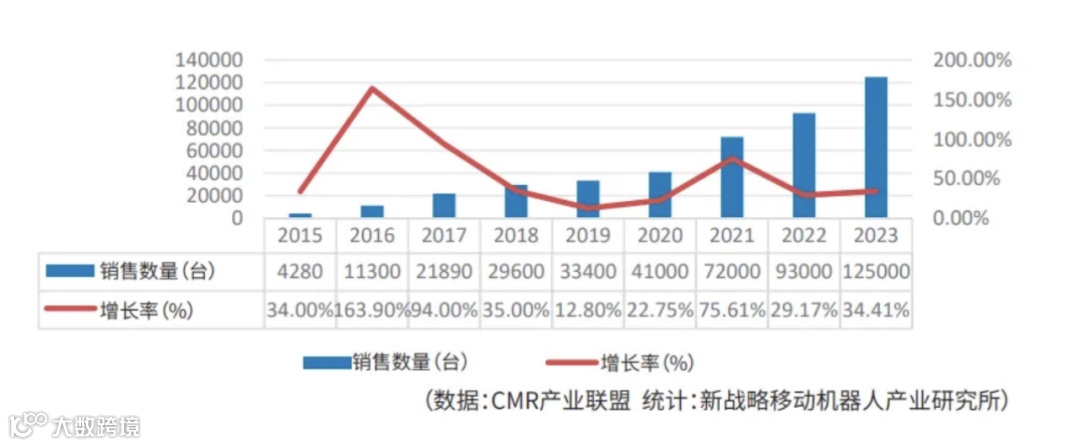 2015~2023年中国工业应用移动机器人(AGV/AMR)销售数量与增长率(台)