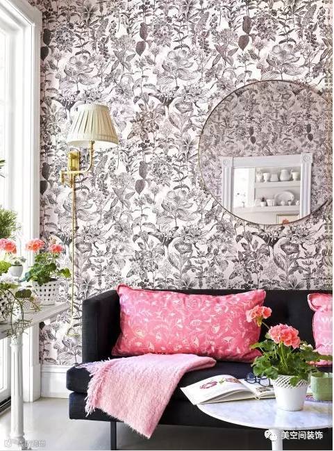 华丽的墙纸,让整个空间变得与众不同,用粉色的靠枕点亮这个角落,圆圆的墙面镜让这里更明亮显得空间更大,装一个有特色的休闲区,在这里聊天才不会无趣。