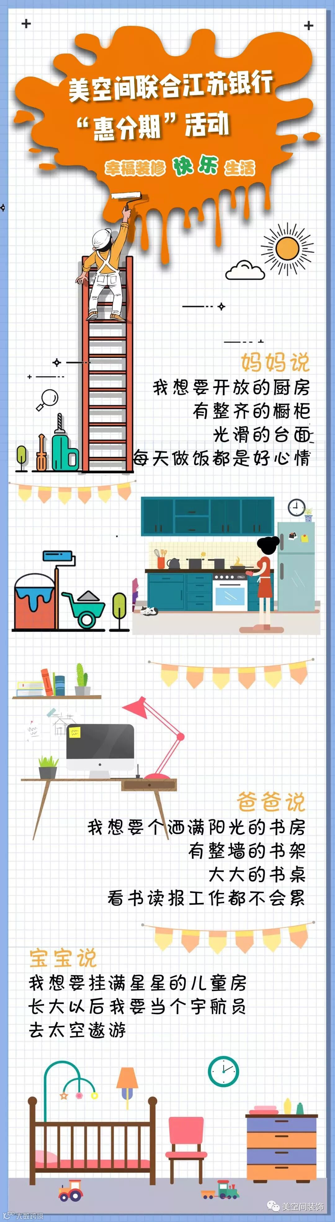 江苏银行和没空间提供家装分期服务,第一年利息由美空间公司支付,一年之后由您自己承担,手续费率为3.5%/年,最长可分期60期。