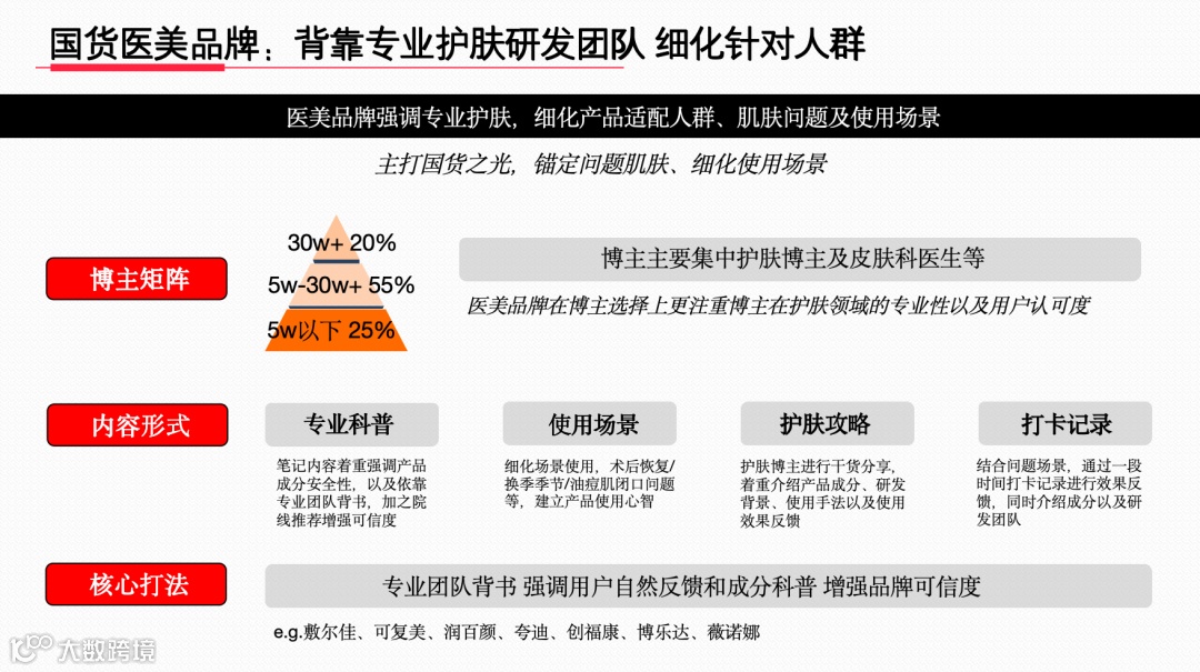 依靠专业研发团队,细分适配人群、肌肤问题与场景。博主集中于护肤博主及皮肤科医生等专业人士。通过专业科普、使用场景展示等内容,强调成分安全、专业背书与用户反馈,以专业增强品牌可信度。