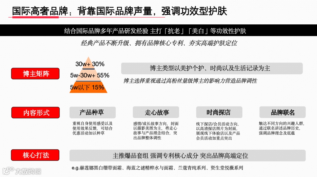 国际高奢美护品牌依托强大品牌声量,聚焦功效护肤,通过分层级博主矩阵,以产品种草、走心故事等多元内容形式,主推含专利成分的爆品套组,稳固高端定位。