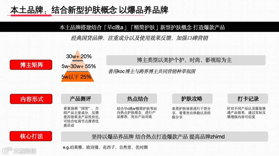 结合 “早 c 晚 a” 等新型护肤概念打造爆品。博主矩阵涵盖美护、时尚、影视综类,善用 koc 与跨界博主。以产品测评、热点结合等形式,突出 “国货” 属性、成分及效果,坚持以爆品养品牌,借助热点提升品牌知名度。