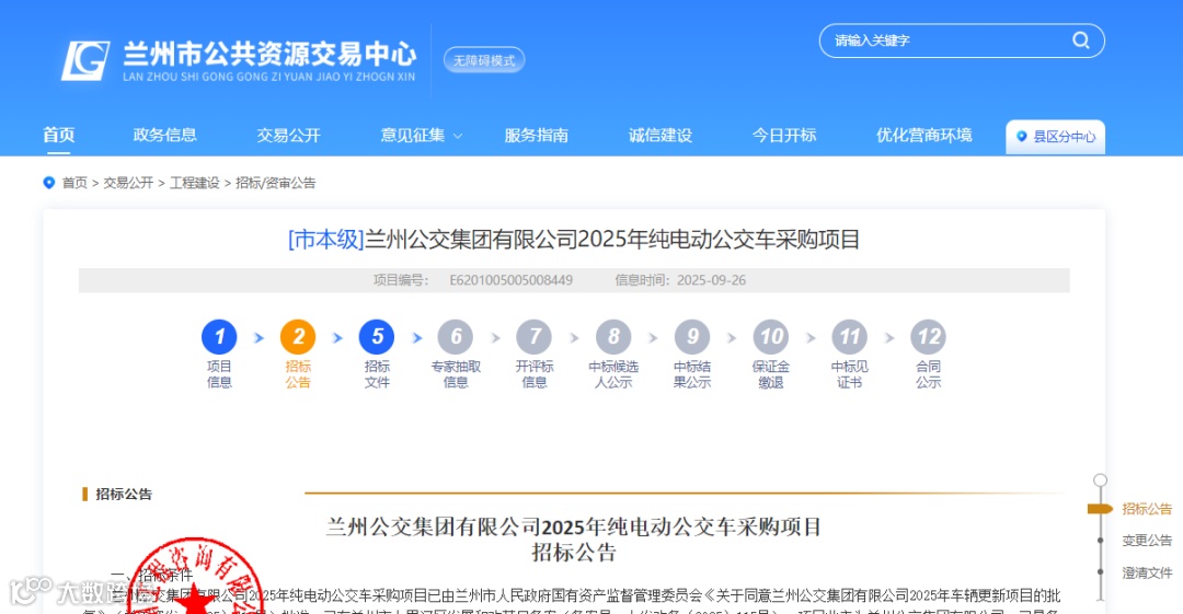 近日,兰州市公共资源交易中心发布兰州公交集团有限公司 2025 年纯电动公交车采购项目招标公告,本次招标将采购400辆纯电动公交车,采购预算合计40150万元。