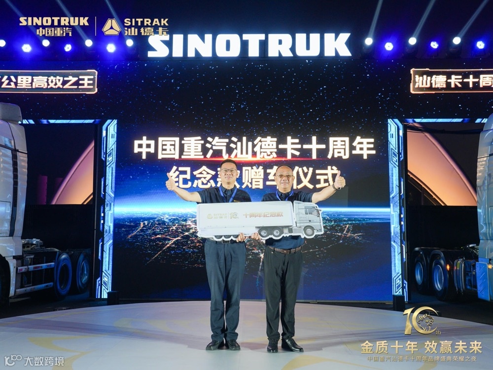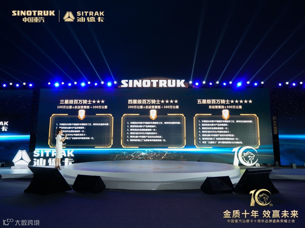 除了产品方面的精进深耕,汕德卡持续领先的秘诀在于万千用户的信赖与拼搏,才能造就一个个里程碑式的运营传奇。“十周年品牌盛典荣耀之夜”现场,汕德卡独创行业首个“五星百万骑士团”,以不同百万运营里程的差异化权益,邀约客户共创共赢,携手开启下一个十年全新篇章。令人心潮澎湃的是,达成 300 万公里运营里程的汕德卡车主付忠艳,获得了中国重汽赠予的限量车型汕德卡C9H十周年纪念款一台。