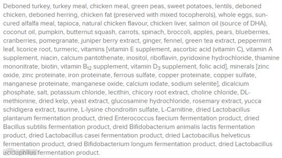 去骨火鸡,去骨鸡肉,火鸡茸,鸡肉茸,青豌豆,甜薯,扁豆,鲱鱼,三文鱼,鳕鱼,鸡脂(混合生育酚保存),全蛋,天然鸡肉香料,鸡肝,晒干苜蓿粉,三文鱼油(DHA来源),椰子油,南瓜,胡桃南瓜,胡萝卜,菠菜,西兰花,苹果,蓝莓,蔓越莓,石榴,杜松子提取物,生姜,茴香,洋甘菊,薄荷叶,甘草根,姜黄,维生素(维生素E,维生素A,维生素B3,维生素B5,维生素B2,维生素B6,维生素B1,维生素H,维生素B12,维生素D3,维生素B9),矿物质(硫酸锌,蛋白锌,蛋白铁,硫酸亚铁,蛋白铜,硫酸铜,蛋白锰,氧化锰,碘酸钙,亚硒酸钠),磷酸二钙,盐,氯化钾,DL-甲硫氨酸,卵磷脂,L-赖氨酸,氯化胆碱,酵母提取物,干海带,菊苣根提取物,丝兰提取物,氨基葡萄糖盐酸盐,牛磺酸,硫酸软骨素,迷迭香萃取物,左旋肉碱,干嗜酸乳杆菌发酵产物,干酪乳杆菌发酵产物,干两岐双歧杆菌发酵产物,干粪肠球菌发酵产物。