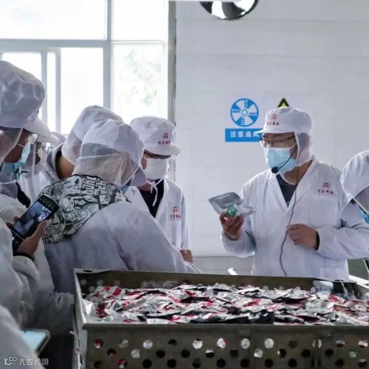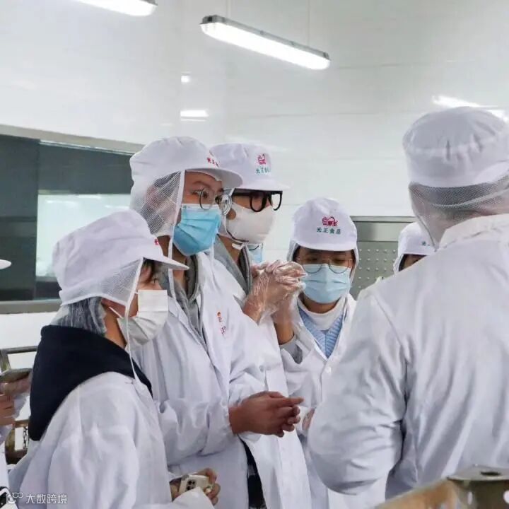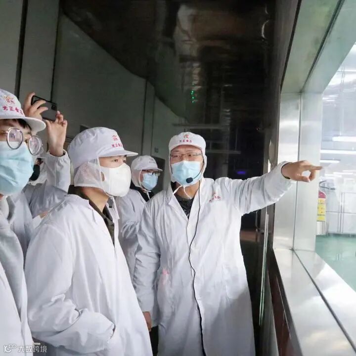 在黄经理的带领下,学生们一同来到生产车间探究正光食品的生产过程,参观现场。学生们近距离观察企业的现代化生产车间、厂房设备、产品化验等生产加工全过程,学生们一边参观交流,一边认真聆听黄经理从甄选原材料到生产工艺、产品检验、合格出厂等流程的介绍。
