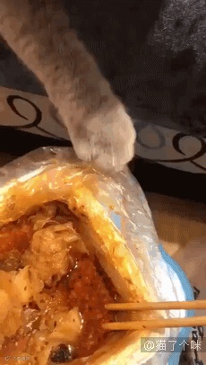 这只猫想吃铲屎官的外卖,被无情打手手后,反手就把铲屎官的筷子弄掉,真·暴躁·小气喵。