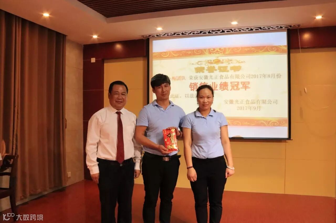 恭喜袁启经理、朱军经理获得月度销售第二名,恭喜李晓梅经理带领的团队获得月度销售冠军,主持人邀请公司总经理望正光先生上台给他们颁奖,并对本次大会进行点评。