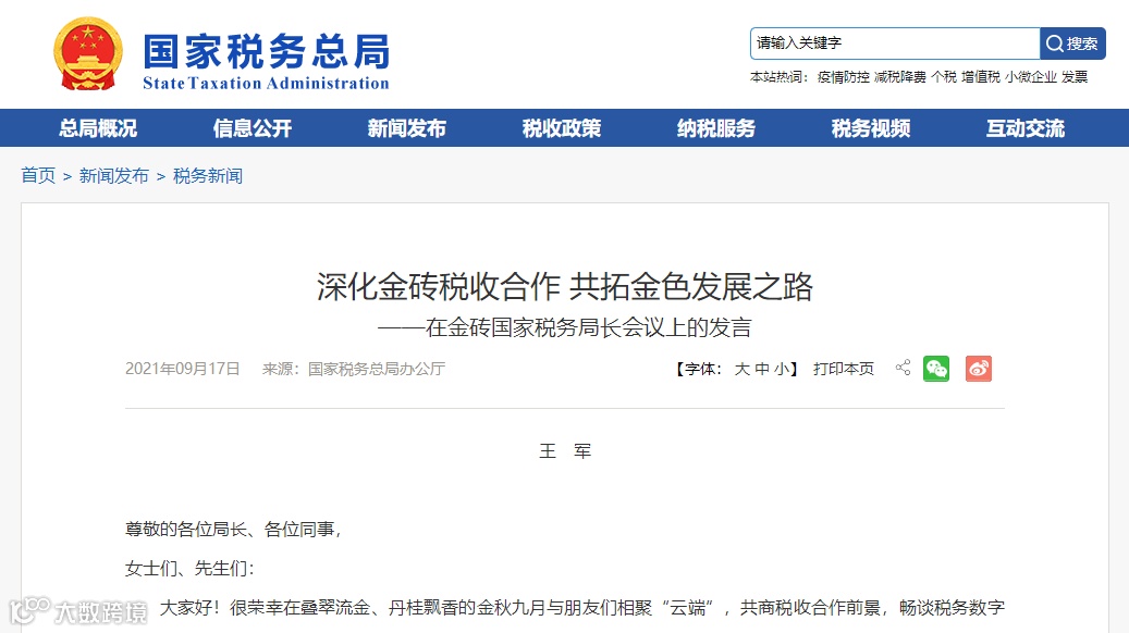 国家税务局长王军在金砖国家税务局长视频会议上发言:我国正向“以数治税”时期迈进,税务工作将进入一个新的时代,金税工程四期建设已正式启动实施!