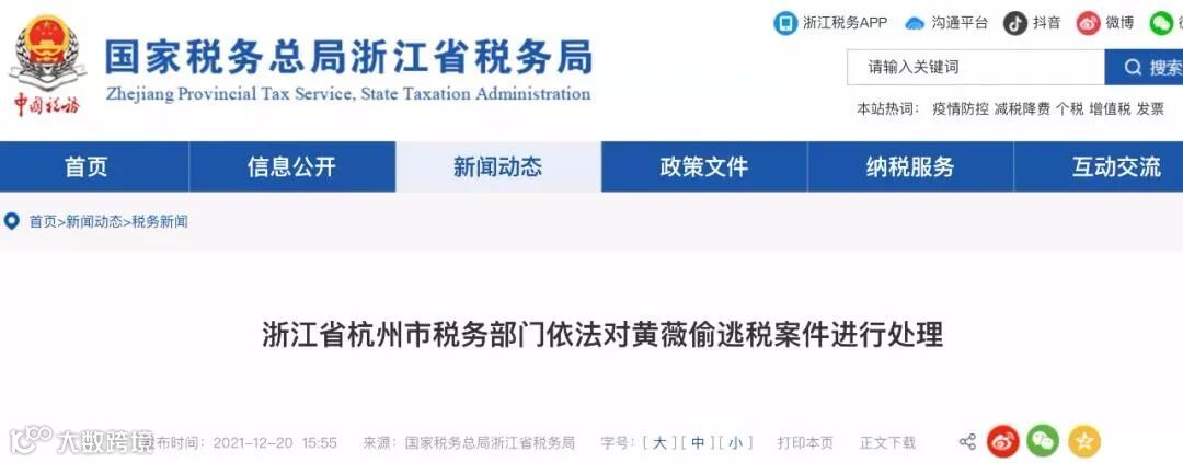 近期,浙江省杭州市税务部门经税收大数据分析发现网络主播黄薇(网名:薇娅)涉嫌偷逃税款,在相关税务机关协作配合下,依法对其开展了全面深入的税务检查。