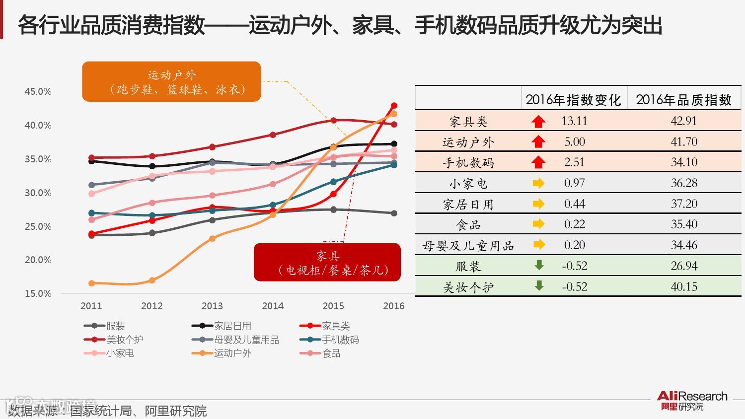 报告对最近5年社会消费品零售总额增速与阿里品质消费指数的增速进行了对比,发现两者呈现此起彼伏的“X”形发展走势:一方面,由于总体规模不断扩大,社会消费品零售总额增速趋缓;另一方面,阿里品质消费指数的增速则从5年前的26.8%增长至去年的34.4%。这说明,“降速增质”将成为未来中国消费的重要特征。