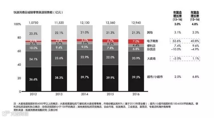 电商渠道依然高歌猛进,销售额增速达到52.6%以上,目前线上销售占快速消费品销售总额的7%,过去两年市场份额实现翻番,大卖场份额下滑了2%,超市或小超市的增速放慢到2%,仅略高于通货膨胀率。便利店通过线上线下连通,完成快速消费,能满足繁忙都市消费者的需求,实现了7.4%的增长。尽管超市/小超市的份额慢慢缩小,但这种业态仍是快速消费品市场的主要形式,依然占据最大市场份额。