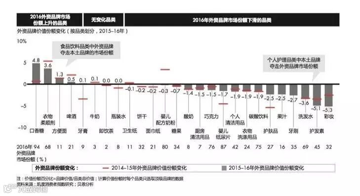 从细分品类上看,报告显示,在2016年本土品牌增长了8.4%,而外资品牌增长为1.5%。其中外资品牌市场份额下降最多的品类是化妆品、护发素、洗发剂和牙刷。很多本土企业开始立足于消费者需求,针对国人打造垂直度更高的产品,可以根据消费者需求的转化快速调整战略。它们专注于细分市场,向消费者提供高性价比产品,满足了他们对价格和质量同样重视的需求。同时,在适应电子商务和社交媒体方便,本土品牌的速度也快于外资品牌。