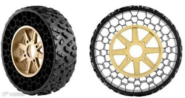 蜂巢式轮胎主要是通过将轮胎内部设计成六边形的结构,从而拥有良好的柔性、较高的弹性以及一定的强度,同时六边形结构也非常利于散热,使得这类轮胎可以应用到高机动性车辆上。