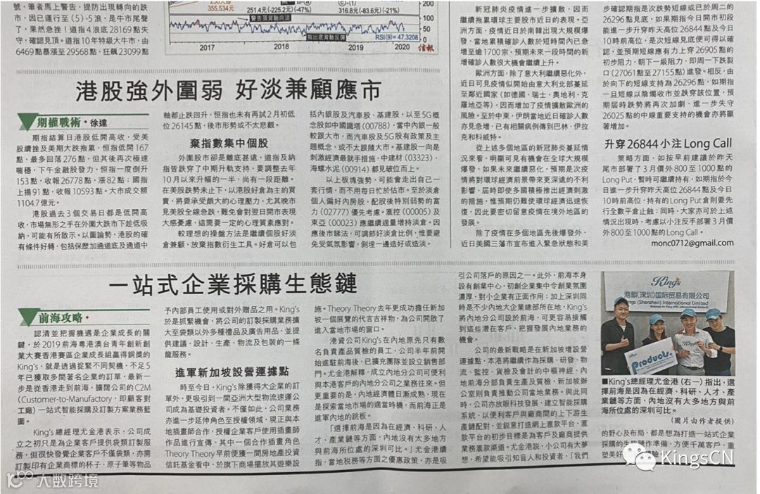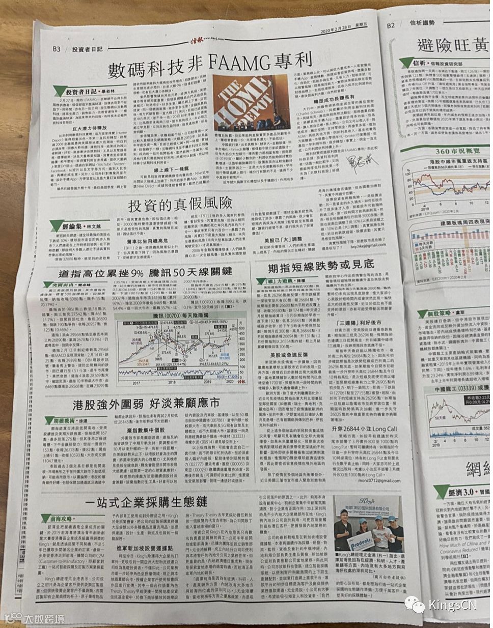 知道Kings荣登香港《信报》,Kings的总经理尤金港第一时间鼓励大家:“Kings First Time on Newspaper!! 沒有您們沒有Kings!Kings是属于大家的。大家努力。真是小公司大夢想,莫忘初衷,方得始終。Tks for everything.”