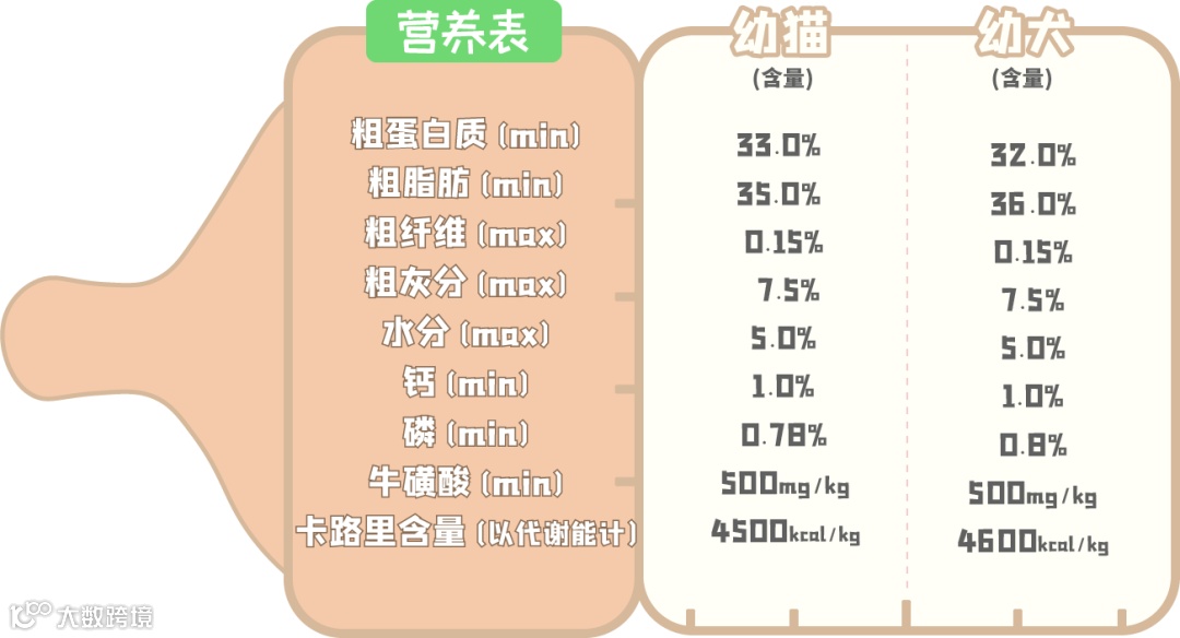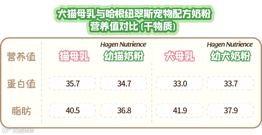 可以看到,犬猫母乳的营养值并不相同,而哈根纽翠斯奶粉不同于大多数奶粉犬猫通用,它根据狗狗和猫咪不同的营养需求特别制定,其蛋白质和脂肪均与母乳非常接近,尤其是蛋白质,相差值不大于1%!