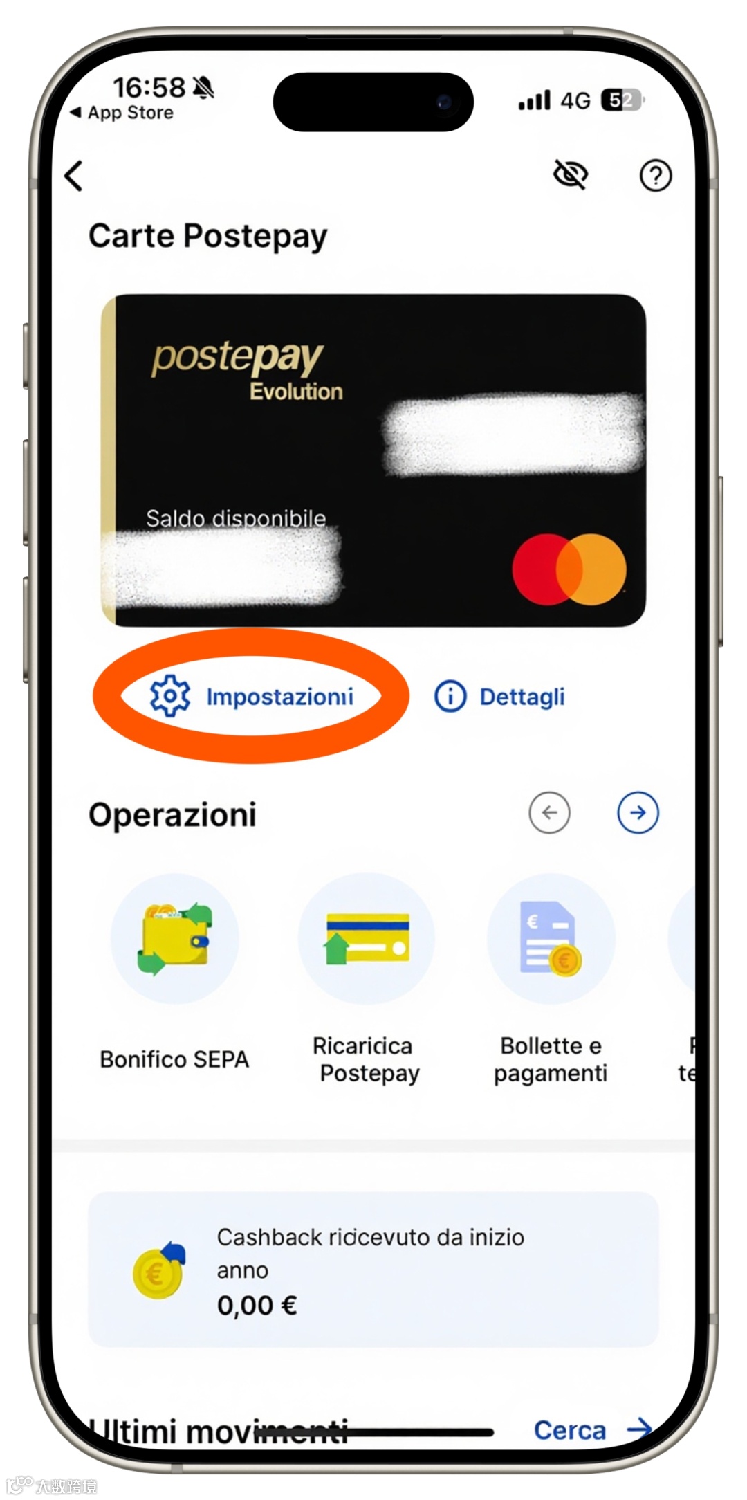 进入卡片详情页后,点击“impostazioni”(卡片设置)。