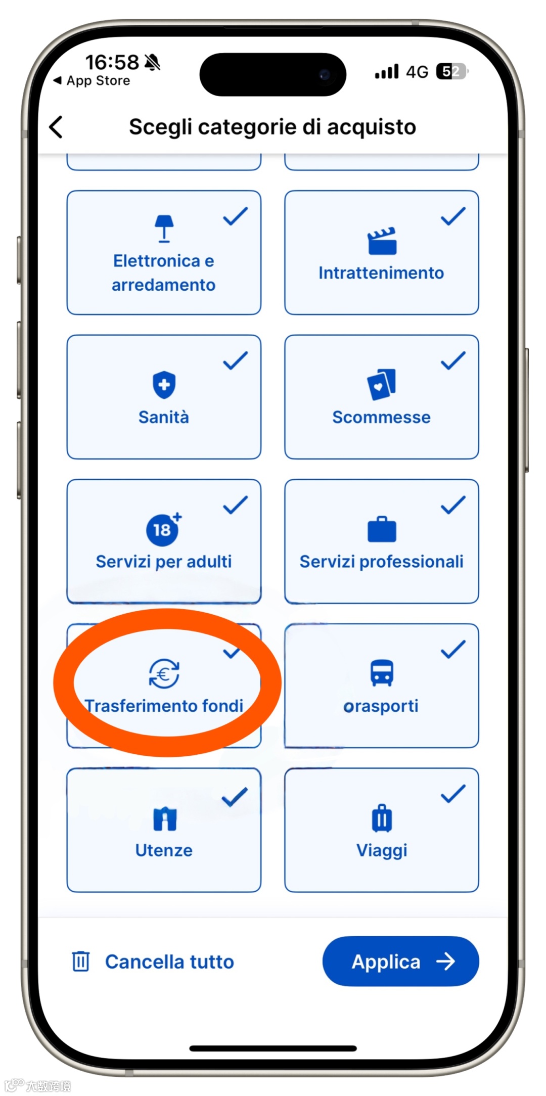 在支付类别中选择“Trasferimento Fondi”(资金转账),然后点击右下角“Applica”(提交)完成设置。
