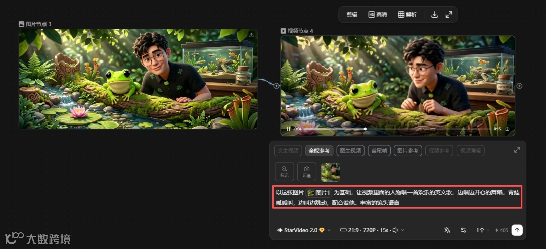 示例:为图片添加"人物演唱英文歌并舞蹈,配合青蛙叫声"的指令,系统自动输出完整视频: