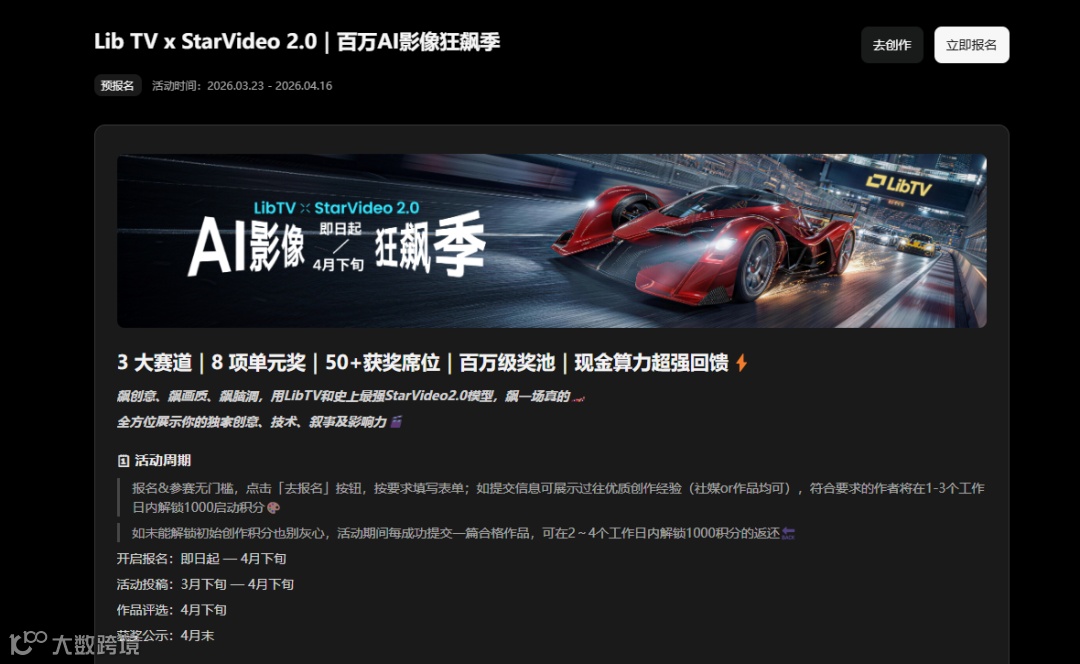 目前StarVideo 2.0模型面向企业团队开放申请。LibTV官网同步开展"百万AI影像狂飙季"赛事。