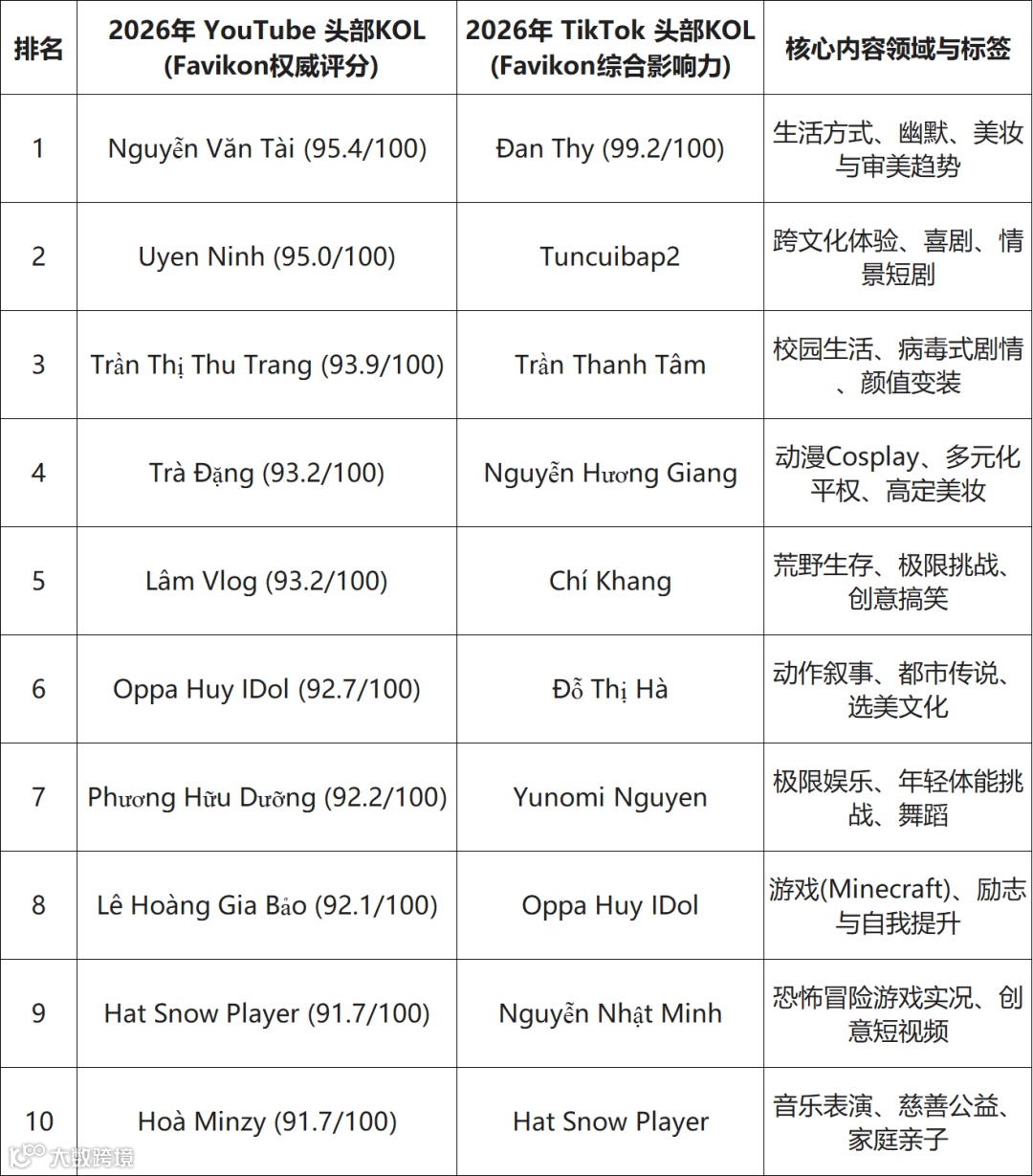 2026年越南KOL生态呈现垂直化、细分化特征。跨平台双栖能力成顶级KOL标配,如Oppa Huy IDol和Hat Snow Player同时霸榜YouTube与TikTok。