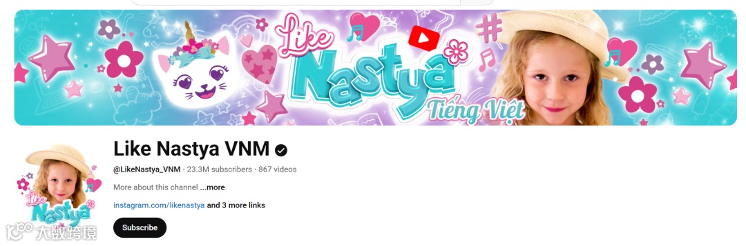 Like Nastya VNM(2330万订阅)统治儿童市场,母婴品类影响力无可匹敌。