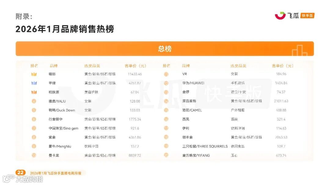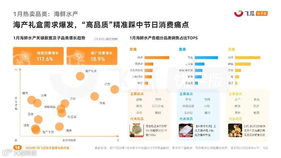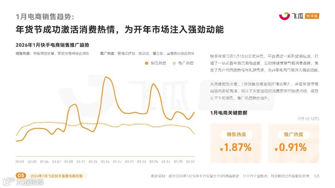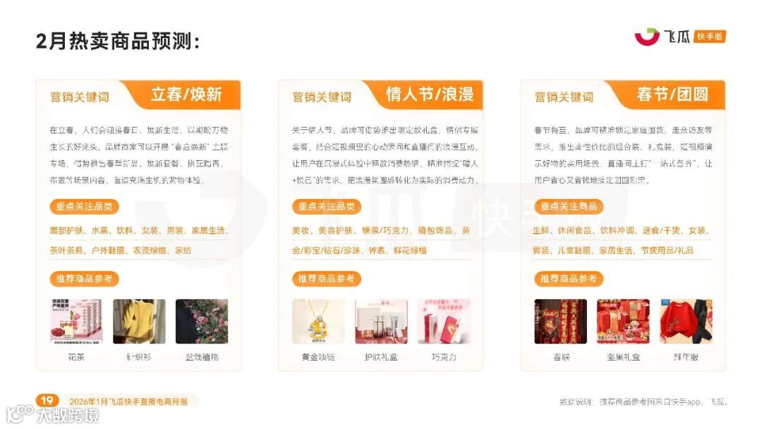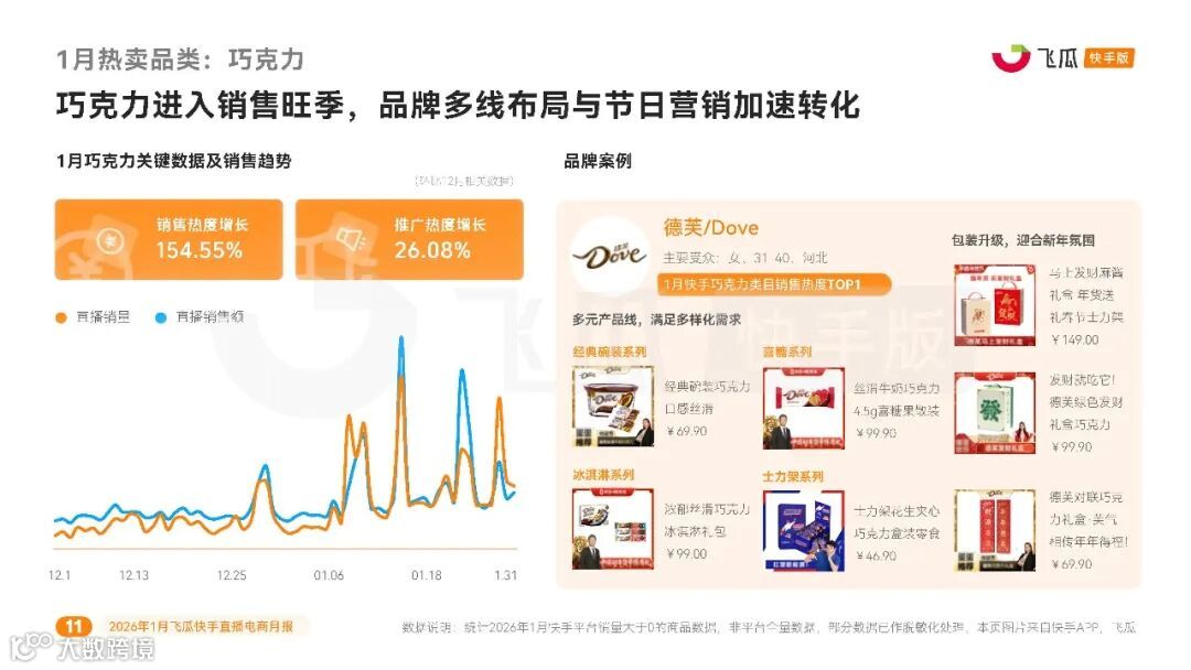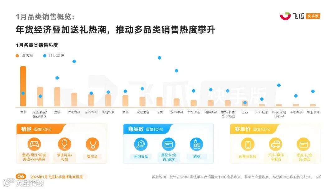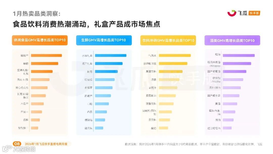 年货经济叠加送礼热潮,让 1 月的快手直播电商多个品类迎来销售热度的攀升,黄金彩宝钻石珍珠、女装、生鲜、休闲食品等品类表现突出,成为拉动市场的核心力量。其中食品饮料类的消费热潮最为汹涌,礼盒类产品更是成了市场焦点,不管是休闲食品还是生鲜品类,礼盒装都成了用户的首选,契合了年节礼赠和家庭囤货的双重需求。