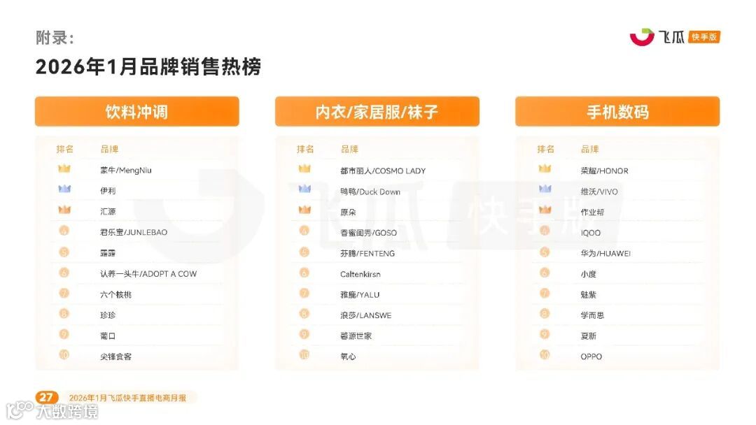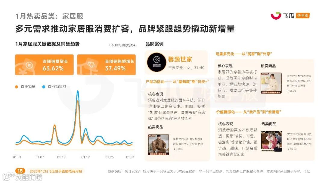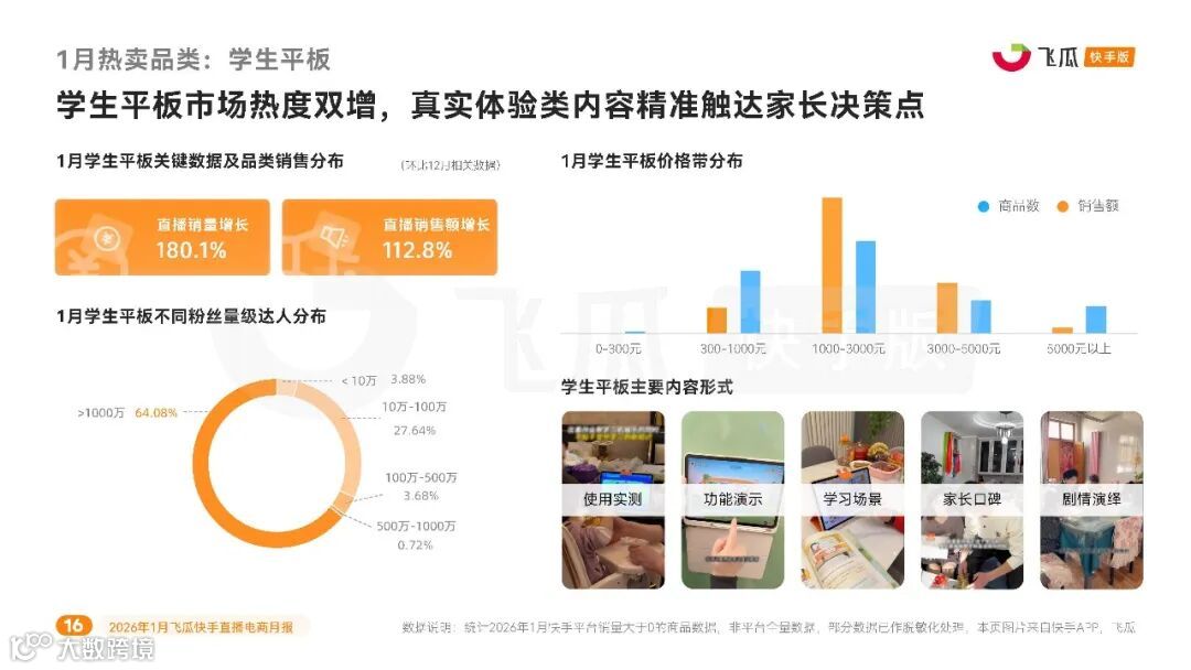 除了食品饮料,家居服和学生平板也在 1 月迎来增长。家居服的消费需求不断扩容,直播销量和销售额均有明显增长,穿着场景从居家延伸到外穿,面料科技和设计颜值成为新的消费看点。学生平板则借着寒假的东风,直播销量环比增长 180.1%,直播销售额增长 112.8%,超六成的销售来自粉丝量千万以上的达人,使用实测、功能演示等真实体验类内容,精准触达了家长的决策点,成为推动销售的重要因素。