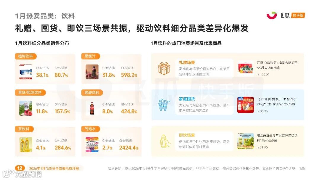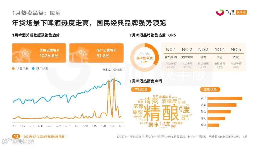 饮料品类在 1 月实现了礼赠囤货即饮三场景的共振,各细分品类差异化爆发。果蔬汁 GMV 增速达到 598.2%,气泡水 GMV 增速 424.8%,茶饮料也有 284.6% 的 GMV 增速,植物饮料则以 38.1% 的 GMV 占比成为饮料品类的主力军。高端礼盒装满足礼赠需求,大包装组合装适配家庭囤货,便携装则贴合年轻群体的即饮需求,不同的产品形态精准匹配不同消费场景,推动了饮料品类的整体增长。啤酒在年货场景下热度大幅走高,销售热度环比增长 1026.8%,推广热度增长 86.8%,品牌集中度 CR5 较高,过年聚会送礼等场景的需求,让醇美清爽、麦香浓郁成为啤酒的热销卖点。