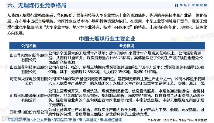 华阳股份、兰花科技等龙头企业依托资源储备、技术优势与一体化产业链占据主导地位;区域性企业聚焦本地民用及小型工业市场形成补充。行业呈现“大型企业主导、地区性企业协同、技术与环保双驱动”特征,未来将加速向智能化、规模化、绿色化方向发展。