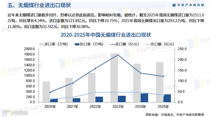 2025年,我国无烟煤进口量1511.6万吨,同比增长4.34%;进口金额121.8亿元,同比下降10.75%。出口量293.2万吨,同比下降11.86%;出口金额32.5亿元,同比下降30.98%。进口量虽回升,但难达历史高位,整体外贸波动对国内市场影响较小。