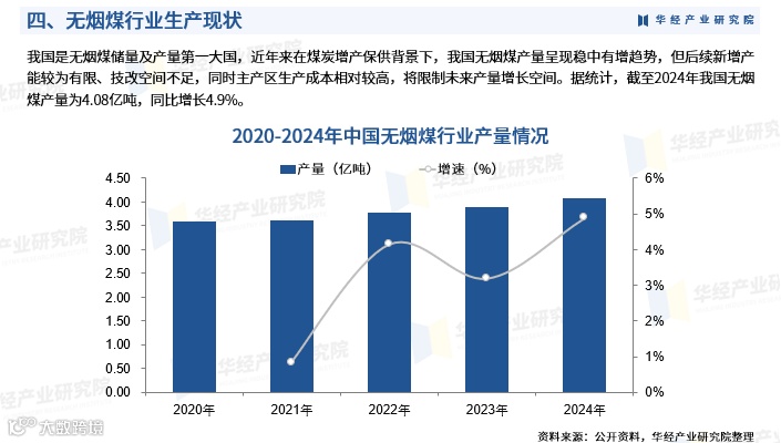 中国是全球无烟煤储量与产量第一大国。在煤炭增产保供政策推动下,2024年全国无烟煤产量达4.08亿吨,同比增长4.9%。但受新增产能有限、技改空间不足及主产区成本偏高等因素制约,后续增长空间承压。