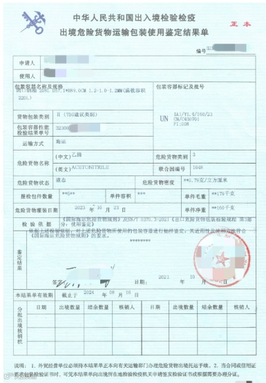 《出境危险货物运输包装使用鉴定结果单》示例(图源网络)