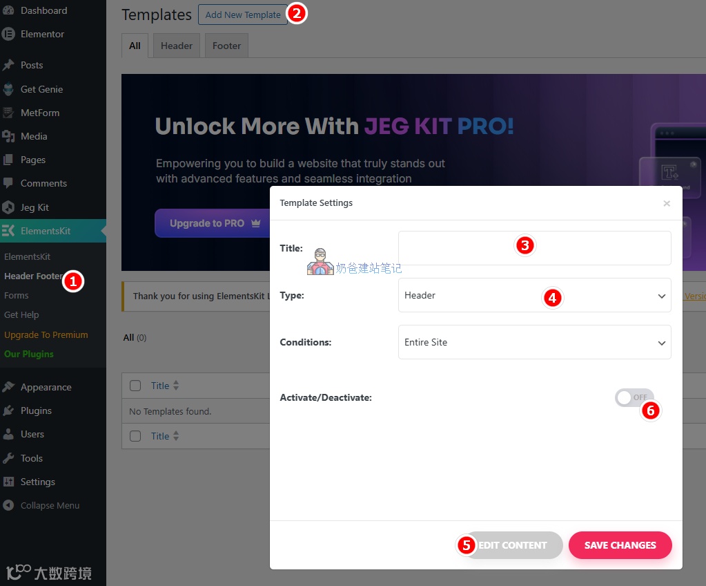返回到WordPress后台,再次进入ElementsKit菜单的Header Footer菜单,编辑刚才的内容,选择启用Activate(图1的第6步)