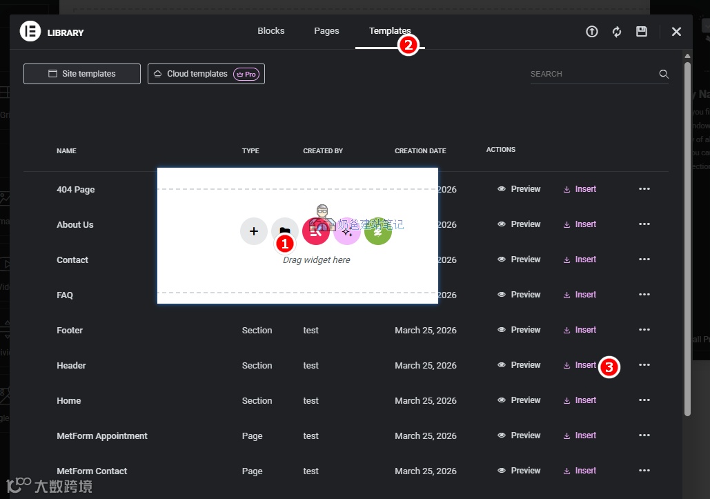 注意,不同的Elementor Templates Kits采用的插件有所不同,页眉页脚创建的方法可能也有所出入。