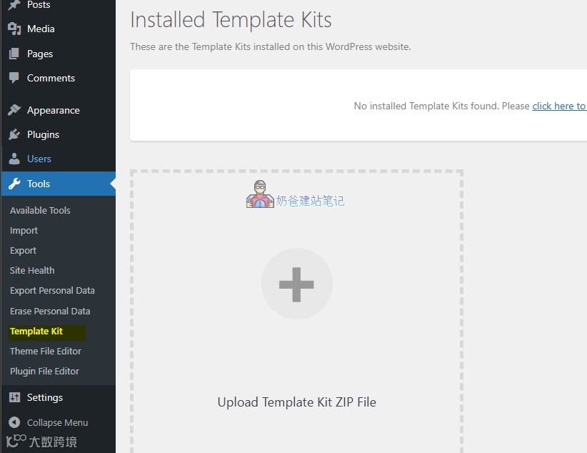 后台工具 – Template Kit – Import,进入插件界面,上传你下载的Elementor Template Kits压缩包。