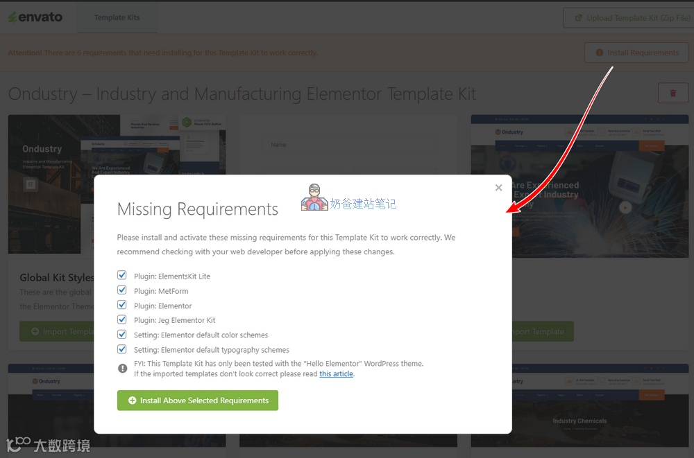 导入界面有一条提示 FYI: This Template Kit has only been tested with the “Hello Elementor” WordPress theme. 这是说这个套件是在Hello Elementor主题上测试制作的,你也可以考虑安装使用Hello Elementor这个主题。