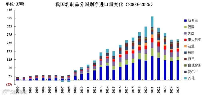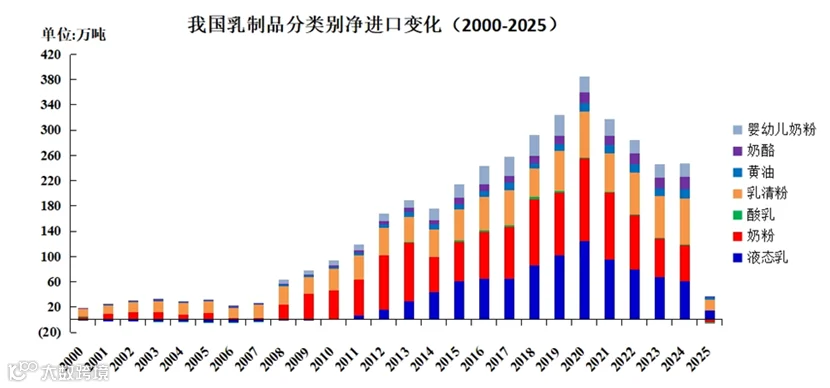 统计的乳制品进口品类包括液态乳、奶粉、酸乳、乳清粉、黄油、奶酪和婴幼儿奶粉。2025年我国乳制品净进口总量为247.1万吨,增长0.6%;其中液态乳、奶粉、乳清粉、婴幼儿奶粉的净进口量分别为60.2万吨、58.1万吨、73.2万吨和21.1万吨。