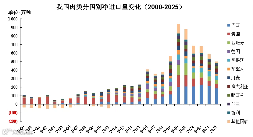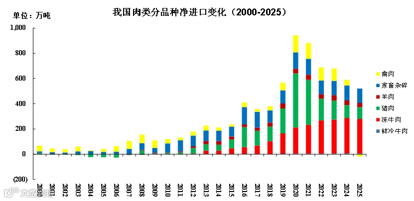 2025年我国肉类净进口量为503万吨,较去年减少14.6%,其中冻牛肉净进口273.3万吨,较去年减少2.5%;猪肉净进口92.1万吨,较去年减少10.0%;国内肉禽养殖规模迅猛增长,禽肉由净进口转为净出口,为2000年以来首次,净出口量17.5万吨,去年净进口43.8万吨;羊肉净进口33.6万吨,较去年减少7.7%;家畜杂碎净进口114.3万吨,比去年减少3.8%。